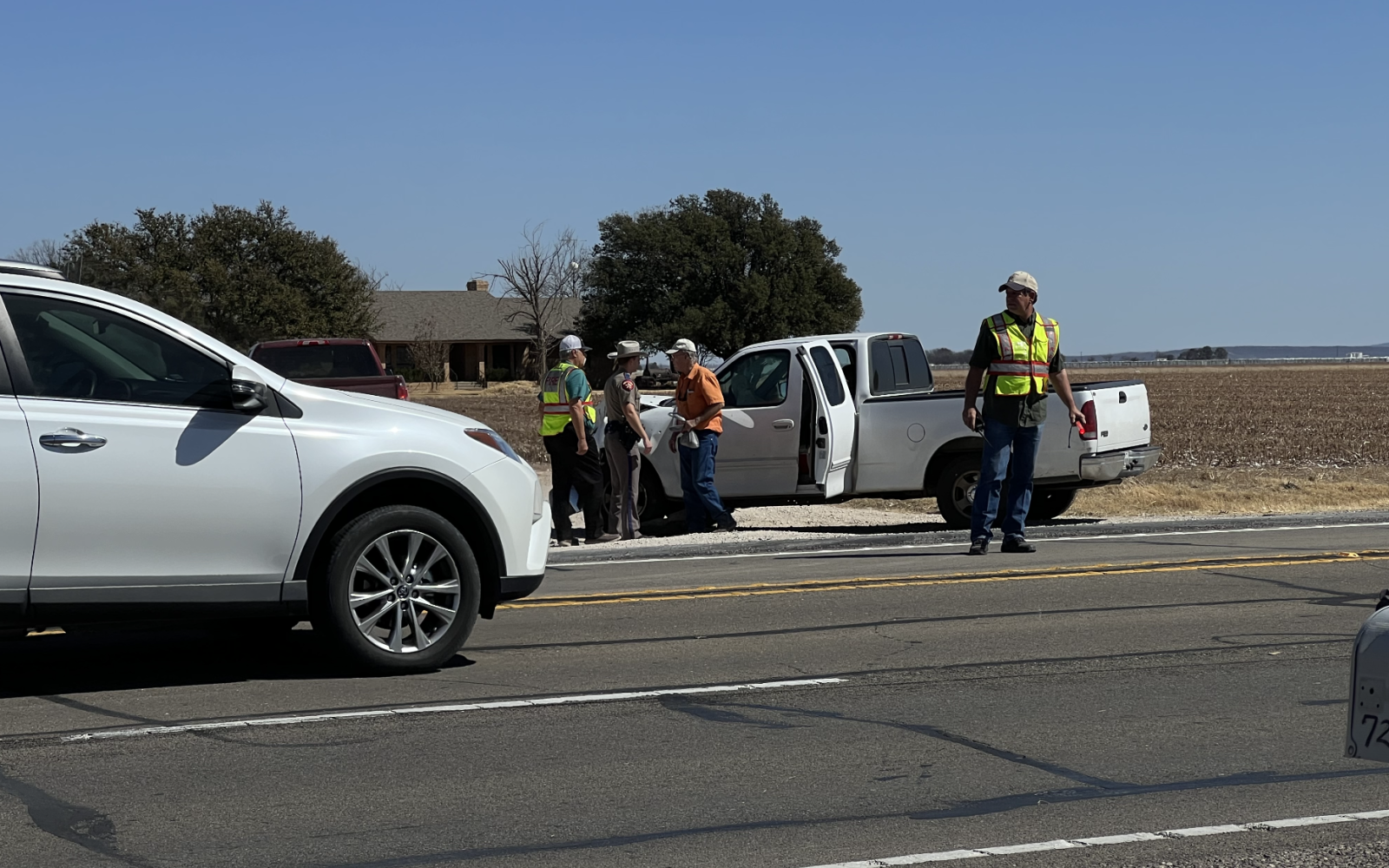 It appears a white Ford F-150 and a Chevy Suburban crashed in the highway. Communications reports indicate the highway was blocked in both directions before first responders arrived.