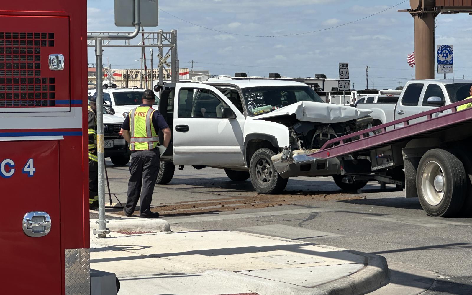 SAN ANGELO, TX — A crash this afternoon at the intersection of South Bryant Boulevard and West Avenue L sent at least one person to the hospital. One white Chevy Silverado had serious front-end damage, but no other vehicle was present.