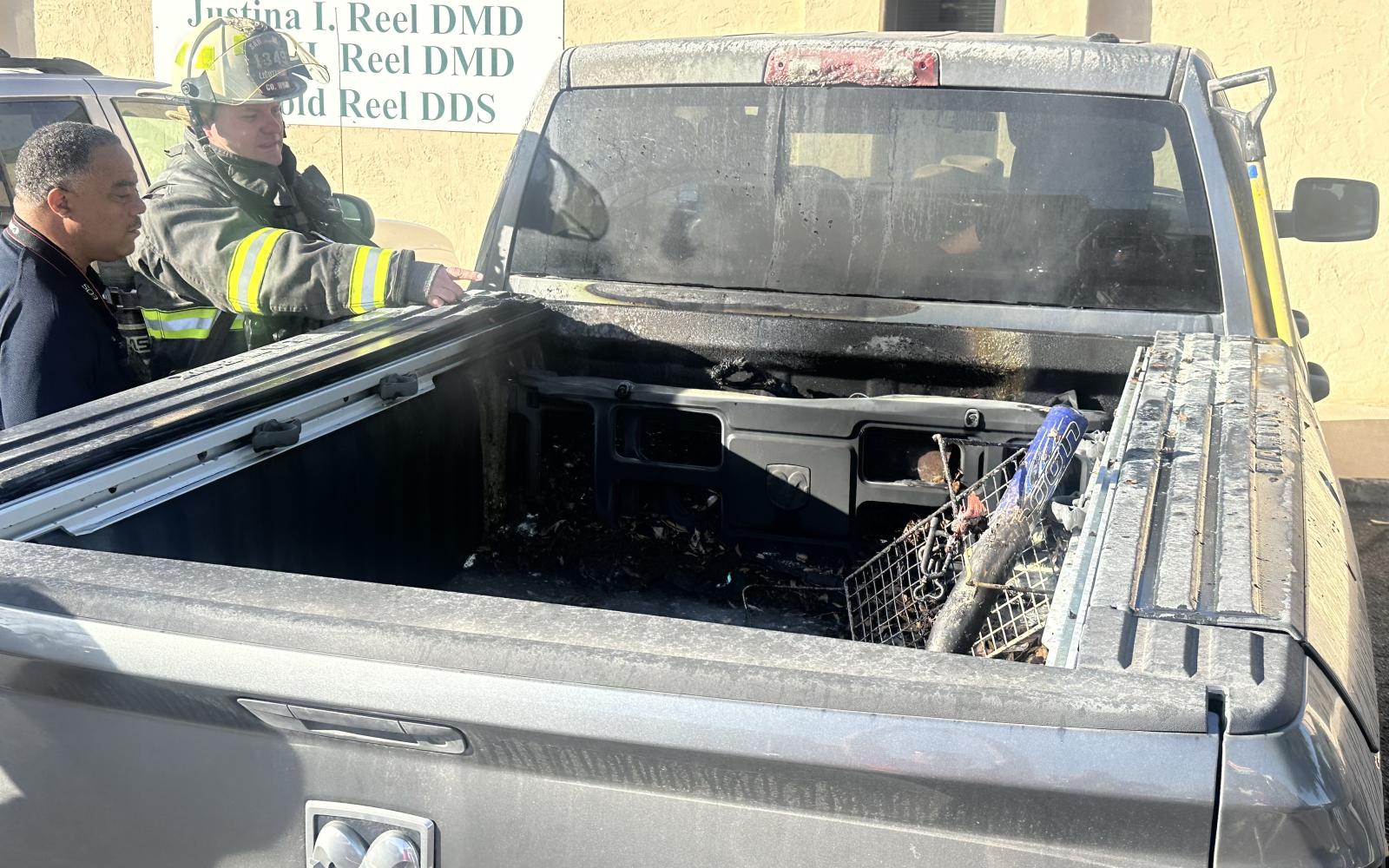The pickup truck suffered noticeable damage, with the third brake light exhibiting melting, accompanied by burned paint just below the rear window.