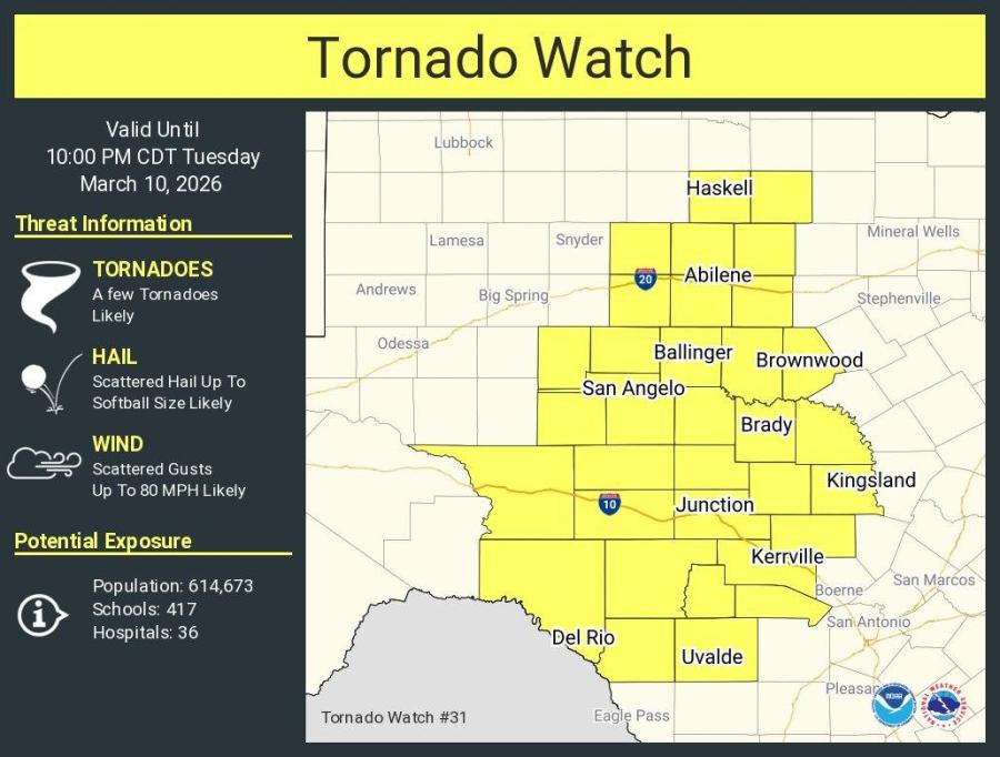 Major cities and towns included in the watch area include San Angelo, Abilene, Brownwood, Sweetwater, Ballinger, Coleman, Brady, Mason, Junction, Ozona, Sonora and Stamford, among others.