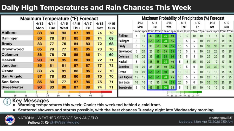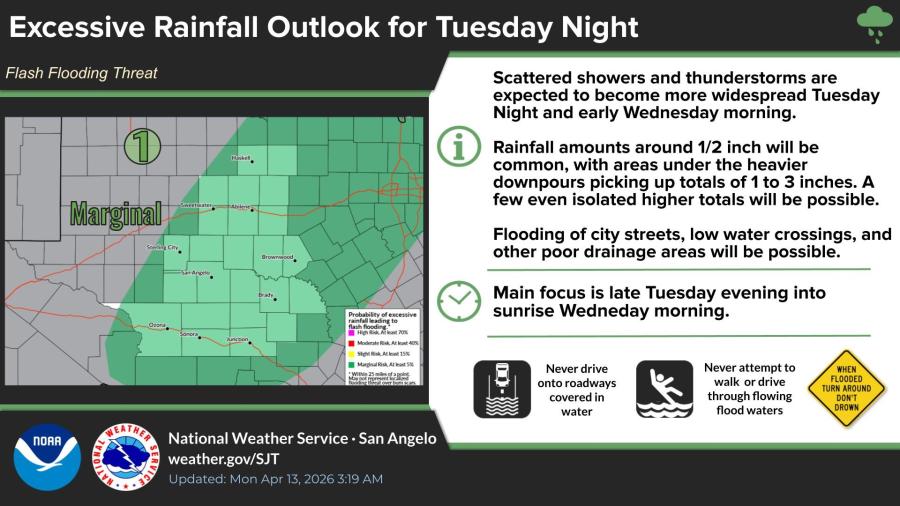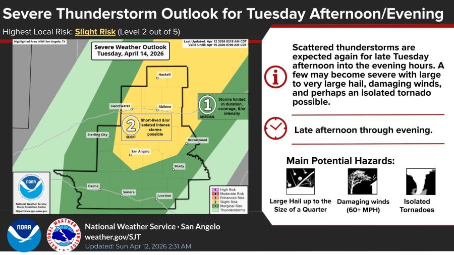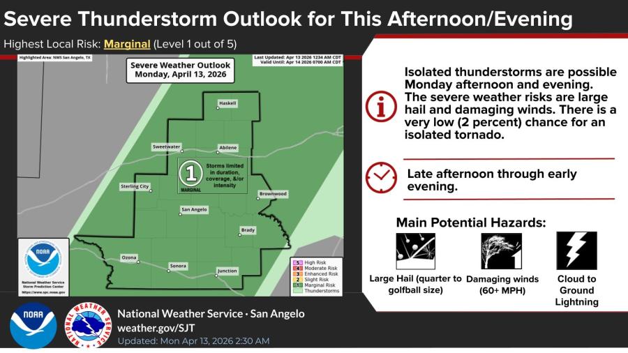 The NWS San Angelo office placed the area under a marginal risk, or Level 1 out of 5, for severe weather. Forecasters said any storms that develop could produce hail up to golf ball size and winds of 60 mph or greater. There is a very low 2 percent chance of an isolated tornado.