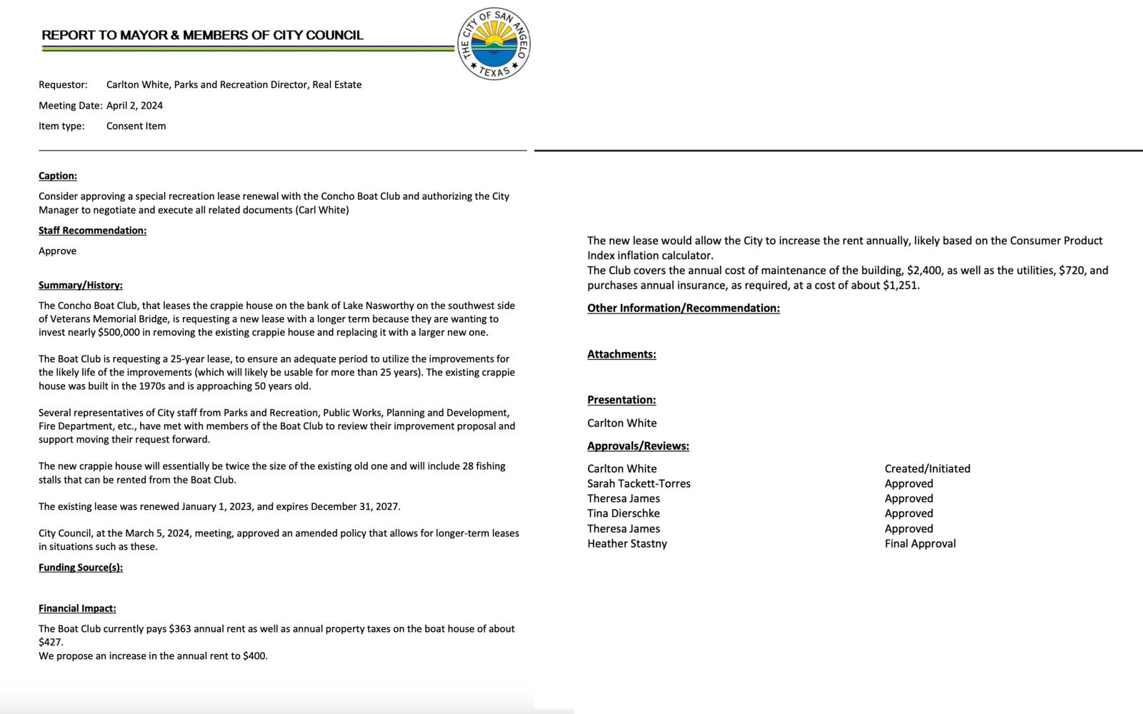SAN ANGELO, TX — The San Angelo City Council has approved an increase in the lease amount for the Concho Boat Club.