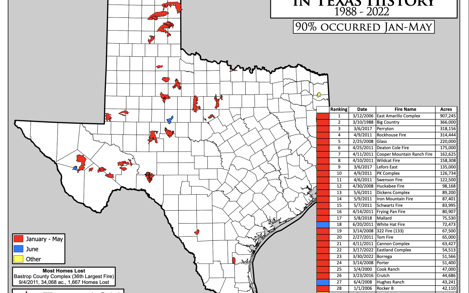 The Smokehouse Creek Fire is now part of a list of the thirty largest wildfires in Texas, which occurred between 1988 and 2022.