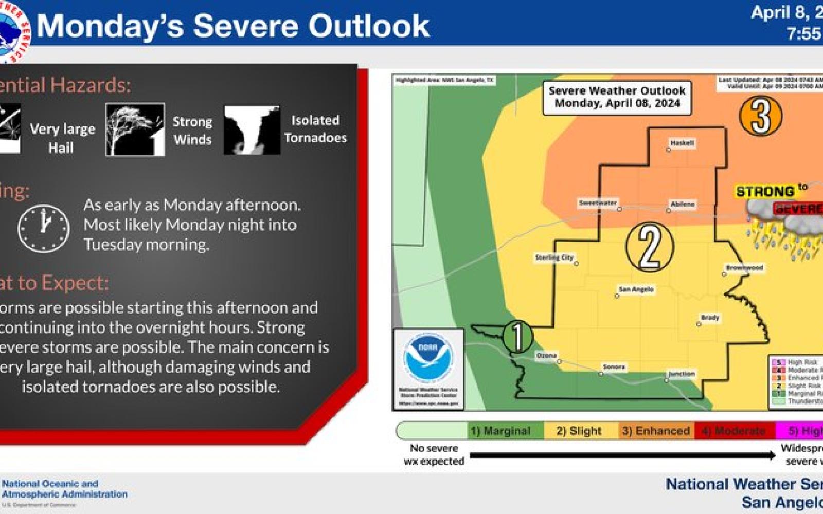 SAN ANGELO, TX — The National Weather Service has issued a warning for residents in the West Central Texas area, indicating a "slight to enhanced risk" of severe thunderstorms.