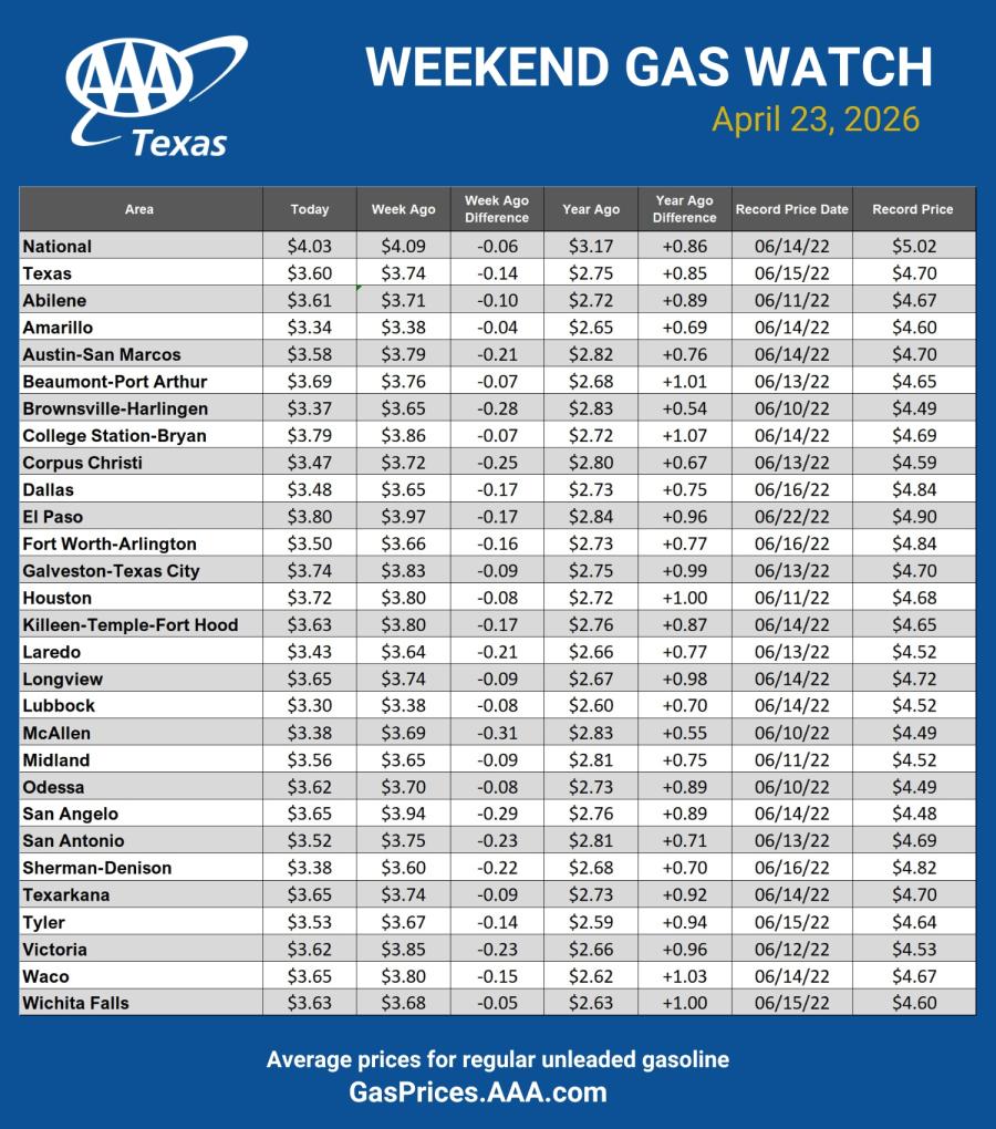 SAN ANGELO, TX - The statewide gas price average in Texas is $3.60 per gallon for regular unleaded fuel, according to the AAA Texas Weekend Gas Watch.